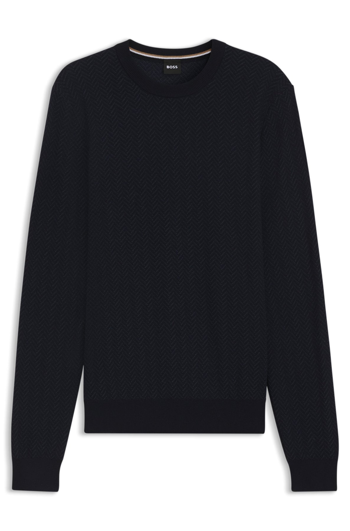 A timeless classic, this BOSS Menswear sweater is detailed with a herringbone structure for easy elegance. Crafted in virgin wool blended with cotton. Regular fit