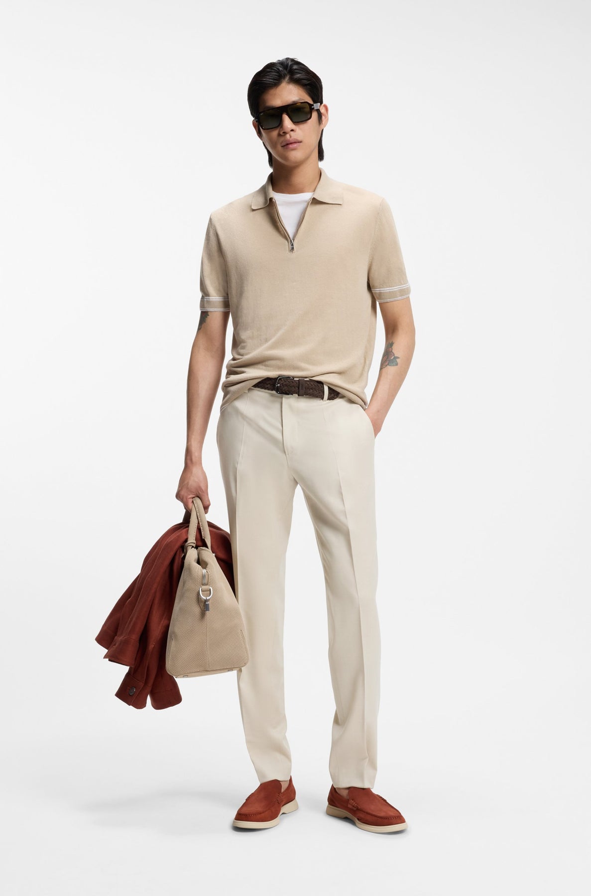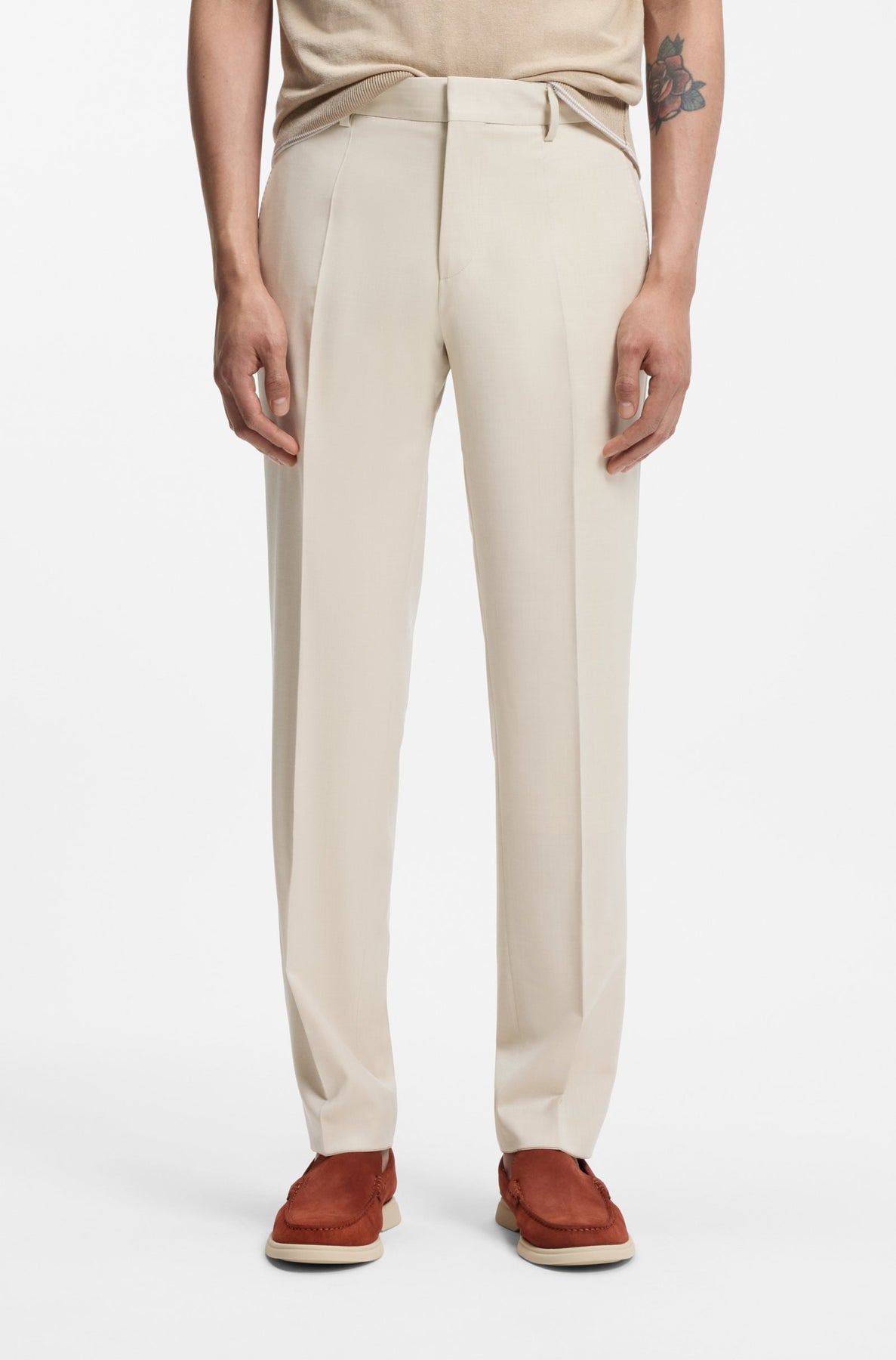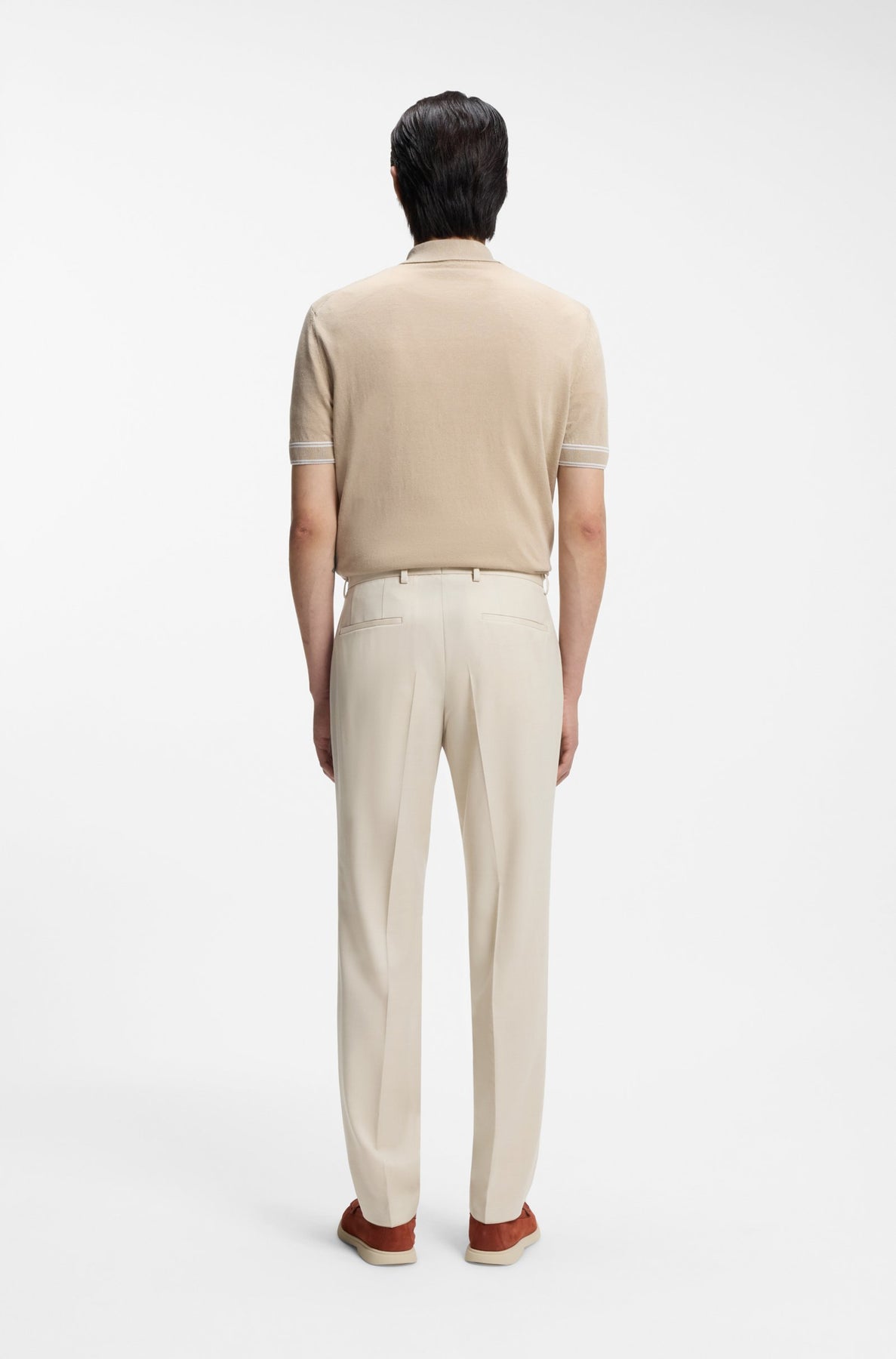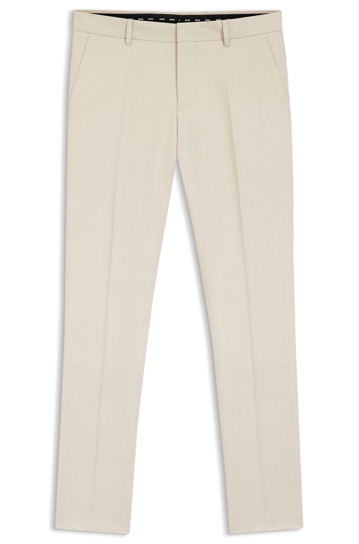 Cut a precise figure in these formal BOSS Menswear trousers. Crafted in finest wool with a serge weave and natural stretch for comfort. Slim fit