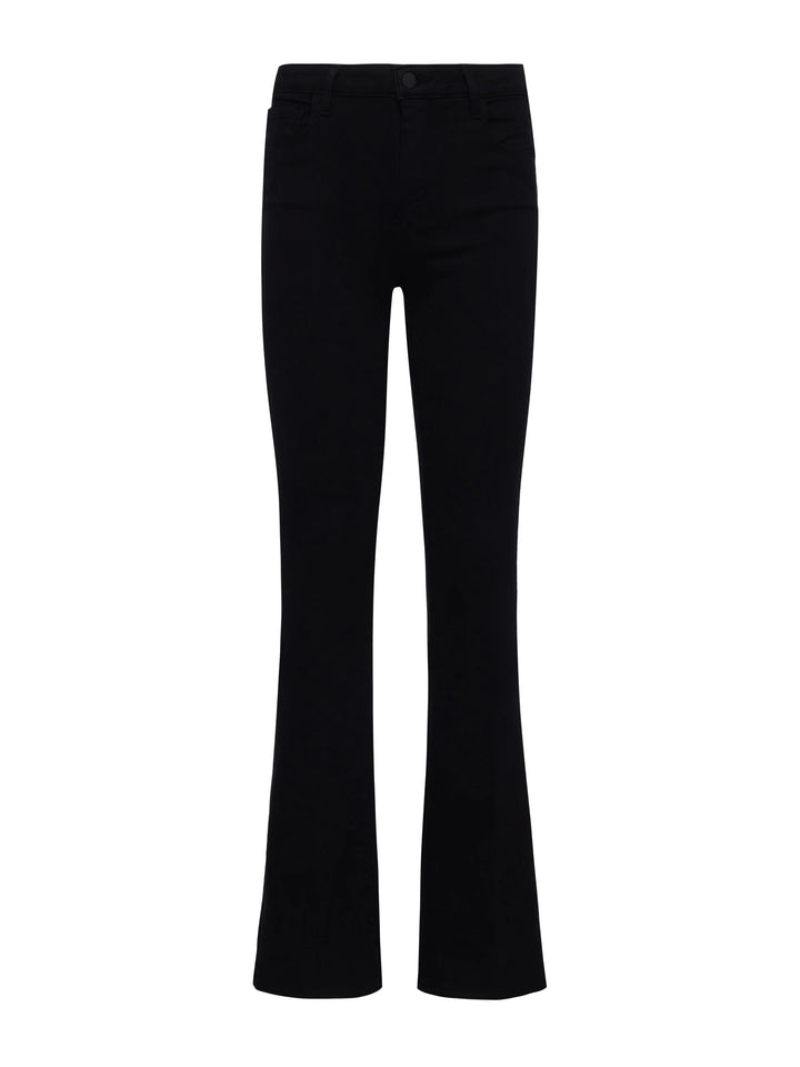 A classic high-rise bootcut jean in true-black. Contoured waistband fits securely at natural waist, then hugs from hip to knee before releasing into a slim bootcut hem. High-recovery super stretch holds its shape, smoothing the figure without sacrificing comfort. Classic five-pocket construction and zip fly closure.